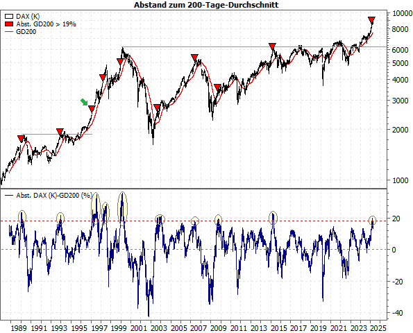 Anhand dieses Charts kann man das nicht eindeutig entscheiden, aber in den 1990er Jahren wurde der Abstand zum GD 200 noch viel größer. Danach sieht es derzeit zwar nicht aus, aber wer weiß. In jedem Fall ist schon allein der starke GD200-Abstand statistisch ein Indiz für ein nahes Hoch im DAX.