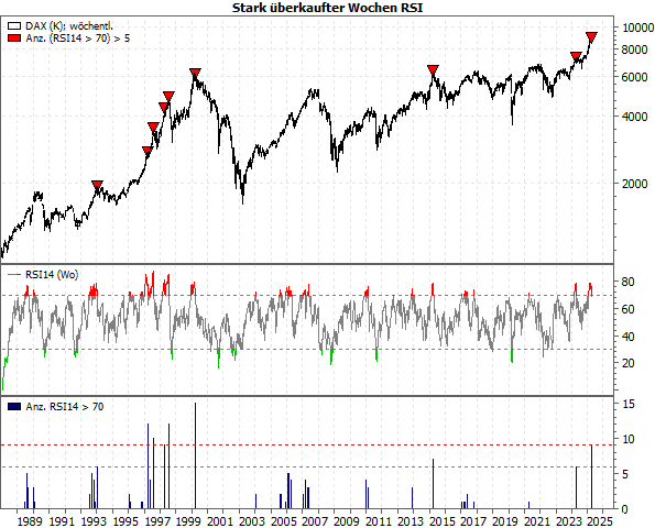 Da es nun in jener Phase so lange so hohe Wochen-RSI gab, habe ich den Filter auf alle Fälle mit einem RSI von mindestens 6 Wochen über 70 ausgeweitet, wovon es ein paar mehr gibt. Diese Zeitpunkte sind ebenfalls im obersten Chartteil mit roten Dreiecken markiert. Und hier sind von den 8 früheren Fällen nur 2, die nicht kurz vor einem Hoch auftraten.
