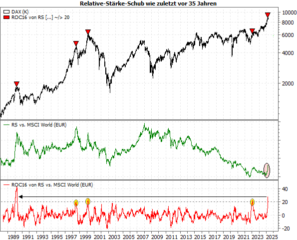 Diese ist im untersten Chartteil dargestellt. Und da zeigt sich, dass es eine derart starke Veränderung der Relativen Stärke zuletzt vor Anfang 1990, also vor 35 Jahren gab (siehe schwarzer Pfeil)! Damals herrschte die Wende-Euphorie in Deutschland, die den DAX zunächst kräftig steigen ließ. Doch schnell folgte eine Wende-Rezession, die ihn danach mehrere Jahre schwächeln ließ.