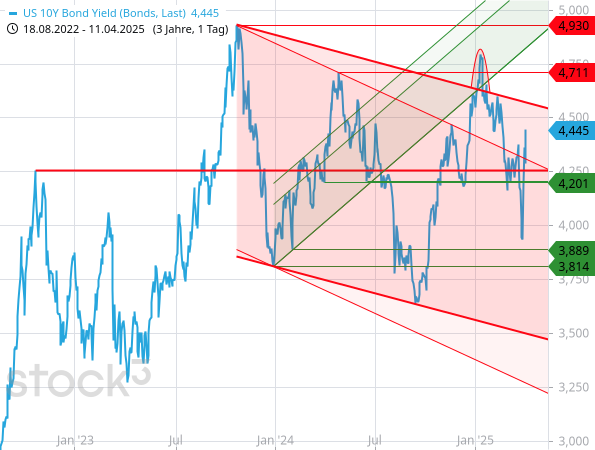 Am Anleihemarkt der USA findet ein Ausverkauf statt. Die Kurse brechen ein und die Renditen schießen entsprechend nach oben. Die Rendite der vom Markt vielbeachteten 10-jahrigen Staatsanleihen stieg in hohem Tempo auf 4,445 %.