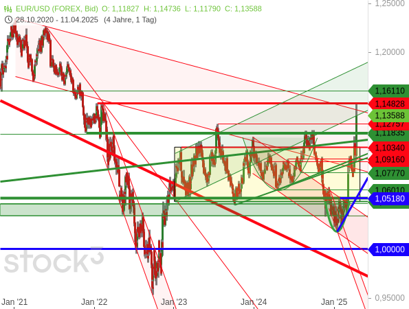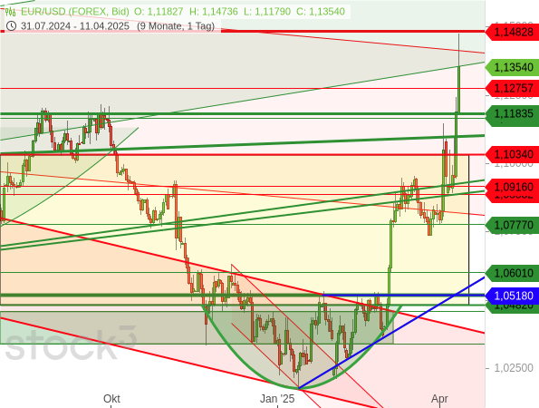 Erst an einem alten horizontalen Widerstand bei 1,14828 USD kam es zu einem Ende der Rally (dicke rote Linie).