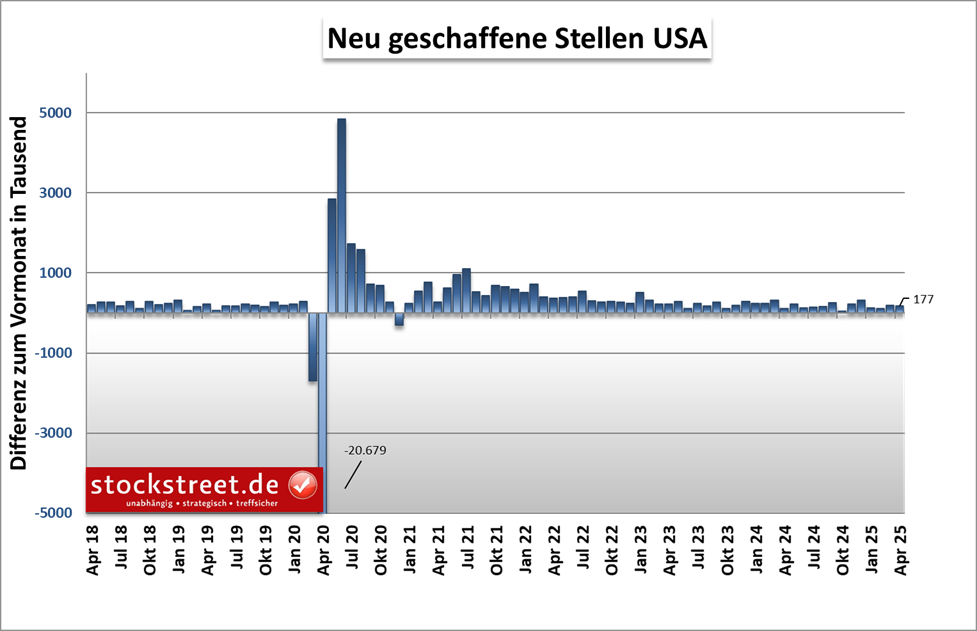 Mit dem ersten Satz lässt sich begründen, warum es trotz des BIP-Rückgangs im 1. Quartal 2025 um -0,3 % im Vergleich zum Vorquartal (siehe „US-BIP: Aktienmärkte auf dem falschen Fuß erwischt“) keine Zinssenkung gegeben hat. Und gleiches gilt mit dem Verweis auf die Inflation im zweiten Satz. Dass zugleich die Risiken höherer Arbeitslosigkeit gestiegen sind, ist dagegen nicht Grund genug für eine Zinssenkung. Zumal sich in den aktuellen Daten noch keinerlei Abkühlung des Arbeitsmarktes ablesen lässt (siehe auch unten).