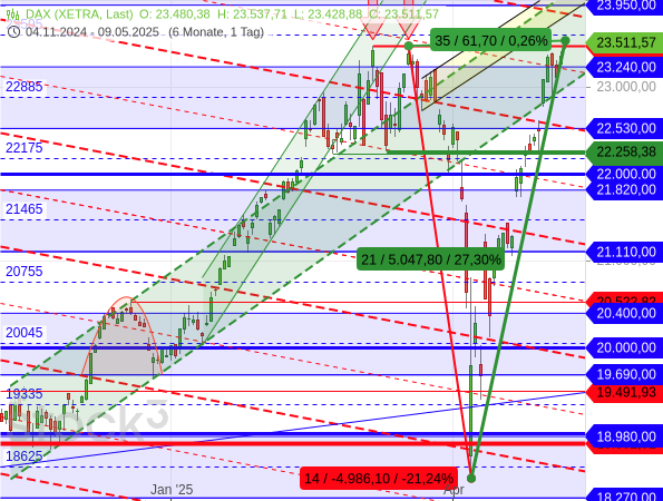 Zumal die vorherige Rally noch gar nicht lange genug und somit ausreichend korrigiert wurde. Daher kommt der Markt im kurzfristigen Bereich von einer charttechnischen Übertreibung in die nächste – und das in einer Situation, in der die Aktien fundamental hoch bewertet sind (siehe „Sind DAX-Werte nun die neuen Magnificent-7?“) und sich das Wirtschaftswachstum wegen der US-Zölle aller Voraussicht nach abgeschwächt. Das passt einfach nicht zusammen.