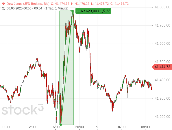Die Aktienkurse machten zuerst einen Satz nach oben, wohl wegen der Info, dass die China-Zölle gesenkt werden, dann aber einen deutlichen Rücksetzer, weil es „nur“ auf 80 % abwärts gehen könnte. Und anschließend setzte wieder „buy the dip“ ein, wie der folgende Chart des Dow Jones beispielhaft zeigt.