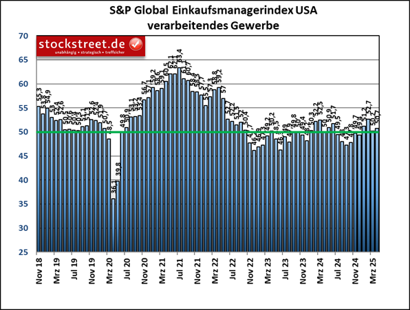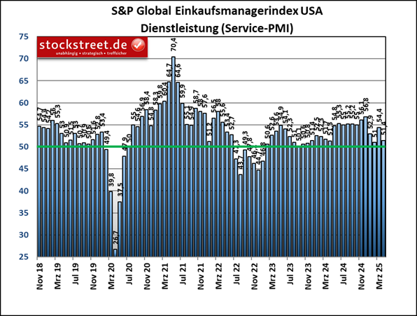 Dazu passen die Einkaufsmanagerdaten von S&P Global. Demnach hat die US-Wirtschaft im April schon merklich an Schwung verloren. Der Einkaufsmanagerindex für die gesamte Privatwirtschaft – also Industrie und Dienstleister zusammen – fiel um deutliche 2,3 auf 51,2 Punkte, wie der Finanzdienstleister S&P Global am vergangenen Mittwoch zu seiner monatlichen Unternehmensumfrage mitteilte.