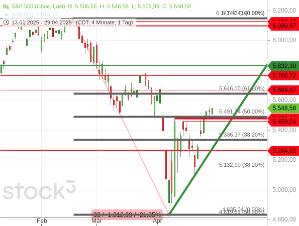 Sollte der Index aber unter das Hoch vom 9. April bei 5.481 Punkten und auch das Hoch vom 14. April bei 5.459,04 Zählern zurückfallen, wäre der bullishe Ausbruch aus dem Dreieck ein Fehlsignal. Und das könnte eine starke Bewegung in die entgegengesetzte Richtung nach sich ziehen, womit die Korrektur wieder Fahrt aufnehmen könnte. Ein interessantes Kursziel wäre dann der Schnittpunkt zwischen der Aufwärtstrendlinie (dick grün) und dem 38,20er Retracement bei 5.336,37 Punkten.