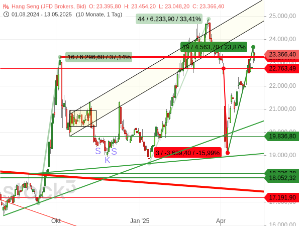 Das wurde von den Anlegern als Signal für ein gemeinsames Vorgehen der Behörden gegen eine wirtschaftliche Abschwächung durch die US-Zölle gewertet. Und solche Maßnahmen waren auch schon im März der Grund für das starke Abschneiden des Hang Seng.