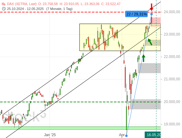 Nicht nur, dass der DAX inzwischen mehr als 29 % in nur 22 Handelstagen zugelegt und damit eine historisch starke Rally hingelegt hat, er hat auch bei knapp 24.000 Punkten, also vor der nächsten runden Marke, gestern deutlich nach unten gedreht und ist dabei zeitweilig unter das alte Allzeithoch gefallen.