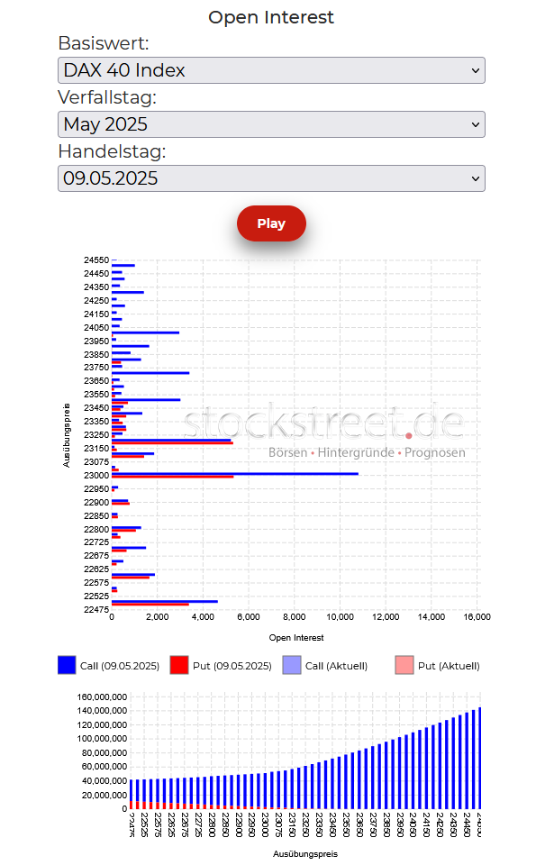 Da die Absicherungen dieser Positionen dann ebenfalls wieder abgebaut würden, wird die Kursbewegung des DAX dadurch wie beim Anstieg verstärkt – nur eben in die Gegenrichtung, also abwärts. Und so könnten nach einem Fehlausbruch am alten Hoch (nach dem ja auch charttechnisch ein stärkerer Rückfall zu erwarten ist) schnell auch die nächsten relevanten Positionen an der Terminbörse ins Visier der Stillhalter geraten.