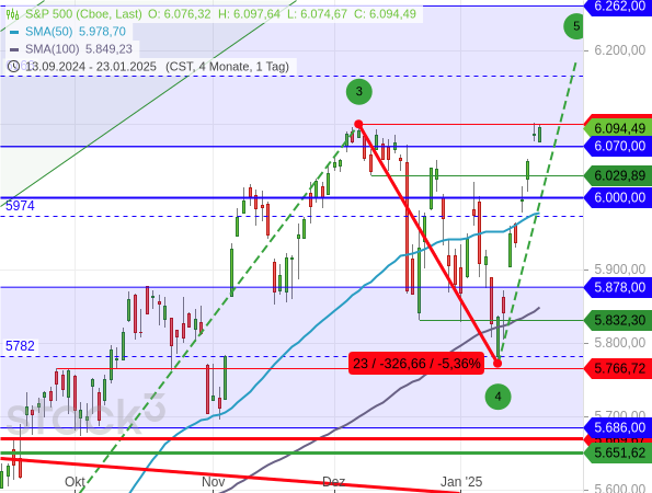 Zumal die US-Indizes ebenfalls überkauft und somit reif für einen Rücksetzer sind. Denn auch der S&P 500 konnte ein neues Rekordhoch markieren, wenn auch nur ganz knapp. Das bisherige wurde am 6. Dezember bei 6.099,97 Punkten markiert, die neue Rekordmarke liegt seit vorgestern bei 6.100,81 Zählern.