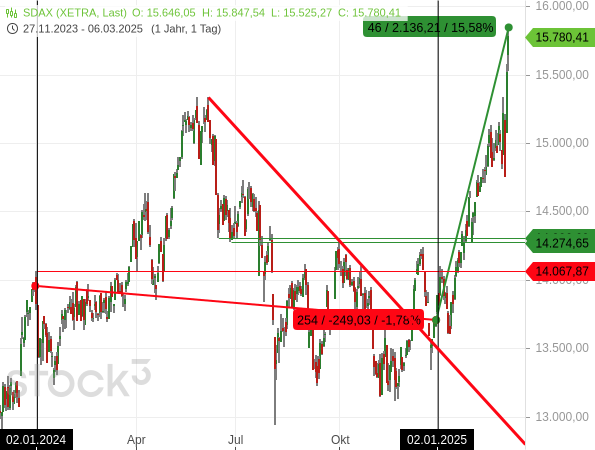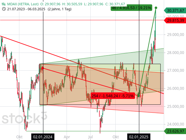 Alleine vorgestern legt der SDAX mehr als 5 % und der MDAX zeitweise sogar deutlich mehr als 6 % zu. Heute kommen noch mal jeweils mehr als +2 % hinzu. Beim SDAX summieren sich die Gewinne dadurch seit Jahresbeginn schon auf mehr als +15 %, nachdem er 2024 einen Verlust von 1,73 % hinnehmen musste.