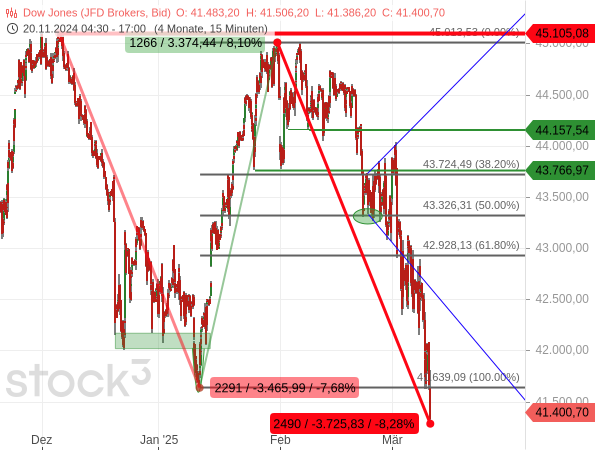 Jedenfalls ist der Dow Jones inzwischen mit seiner zweiten Abwärtswelle auf ein neues Korrekturtief gefallen. Am 26. Februar hatte ich geschrieben, dass man mit einem Bruch des 50er Fibonacci-Retracements und somit weiter fallenden Kursen rechnen muss, wenn die Kurse diese Marke erneut anlaufen (grüne Ellipse im folgenden Chart, siehe „Inflationssorgen und schwächelnde Dienstleister in den USA“).