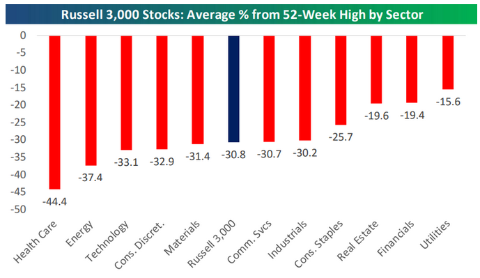 Vor allem mit Blick auf den Small-Cap-Index Russell 2000 ist inzwischen eine Kurserholung fällig. Denn er ist seit seinem Höchststand vom letzten November um -17,3 % gefallen. Dabei beschönigen die Verluste der Indizes die Lage noch. Denn im Durchschnitt lagen die Kurse aller Werte im Russell 3.000, der de facto den gesamten Aktienmarkt in den USA umfasst, laut Bespoke Investment am Freitag sogar schon -30,8 % unter seinem jeweiligen 52-Wochen-Hoch.