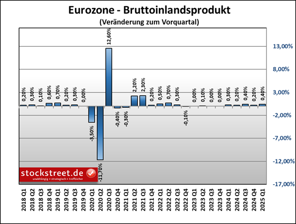 Und nun zuerst die positive Nachricht des Tages: Die Wirtschaft der Euro-Zone ist im 1. Quartal 2025 doppelt so stark gewachsen wie erwartet. Das Bruttoinlandsprodukt (BIP) stieg laut vorläufigen Daten von Eurostat um +0,4 % zum Vorquartal. Experten waren dagegen davon ausgegangen, dass die Wirtschaft lediglich das Tempo des Schlussquartals 2024 von +0,2 % beibehalten kann.