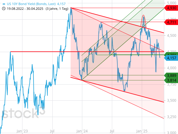 Ich bin gespannt, wer am Ende schlauer ist – die Aktienmärkte oder die Devisen- und Anleihemärkte. Gewöhnlich sind es letztere. Und diese preisen eine Wirtschaftsschwäche der USA viel stärker ein. Die Renditen an den Anleihemärkten sind dieser Tage deutlich gesunken. Die 10-jahrige US-Staatsanleihe rentierte zuletzt nur noch mit 4,157 % und damit auf dem niedrigsten Stand seit Anfang April.