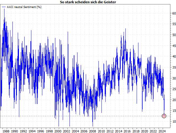 Und die AAII-Daten geben auch einen Hinweis auf die starke Polarisierung der Privatanleger in Bullen und Bären: So fiel der Anteil der Umfrageteilnehmer, die eine „neutrale“ Markterwartung hatten, vor gut zwei Wochen auf nur noch 12,5 %. Das war nicht nur der niedrigste Wert seit der Finanzkrise, sondern auch einer der niedrigsten der Historie – nur in 13 von 1968 Wochen, also nur in 0,66 % der Fälle gab es einen niedrigeren Wert!