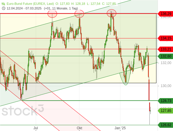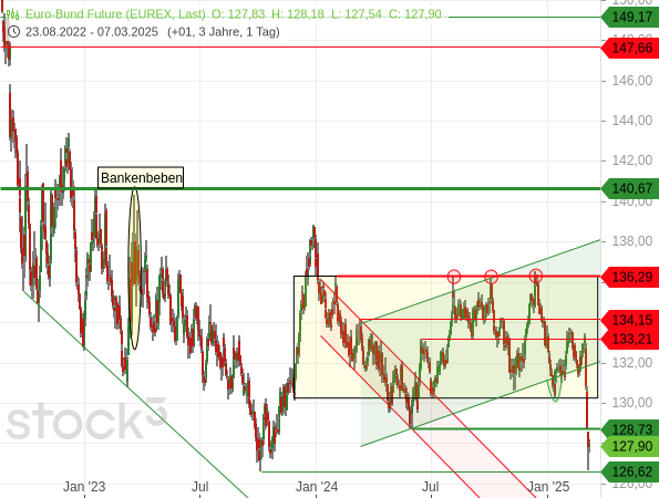 Im Gegenzug brachen die Kurse an den Anleihemärkten ein. Der Bund-Future fiel dadurch am Dienstag aus seinem möglichen Aufwärtstrendkanal heraus (grün im folgenden Chart), am Mittwoch auch noch aus der alternativen Seitwärtsspanne (gelb) und rauschte am Donnerstag auch noch weit unter das Korrekturtief vom Mai 2024 bei 128,73 Punkten.