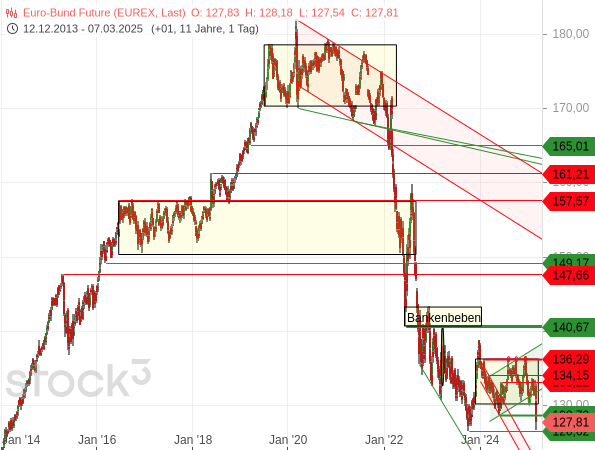 Sollte auch diese Marke unterschritten werden, würde der Bund-Future auf das tiefste Niveau seit 2014 geraten – also auf ein 10-Jahres-Tief.