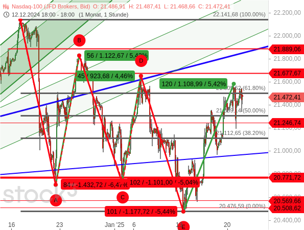 Und wenn ihm nun auch noch ein Anstieg über das Hoch der Welle D gelingt, kann man zunehmend davon ausgehen, dass die ABCDE-Korrektur beendet ist und sich die Kurse bereits wieder auf Rekordjagd befinden.